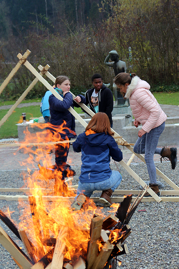 Anschliessend warteten diverse praktische Arbeiten auf fleissige Hände und kreative Köpfe: Es wurden Lieder einstudiert, Kränze und Sternlichter hergestellt, Gedichte, Geschichten und Theaterstücke geschrieben und einstudiert, Weihnachtsfenster geschmückt, die Pausenhalle dekoriert und in der Küche 100 "Grittibänze" gebacken.