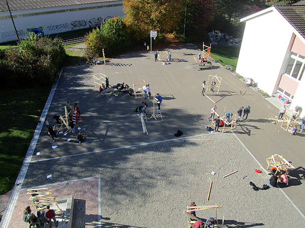 Am diesjährigen Denksportanlass wartete eine besondere Aufgabe auf die Lerngruppen: Jede Gruppe musste einen möglichst hohen Turm aus Dachlatten zusammenzimmern. Dabei galt es zuerst den Turm gemeinsam zu planen, ein Modell herzustellen und anschliessend den Plan in die Realität umzusetzen.