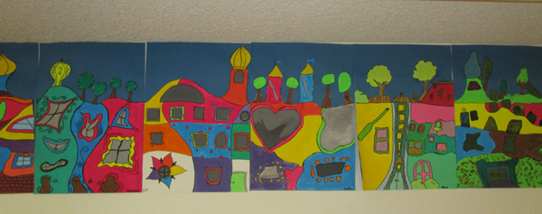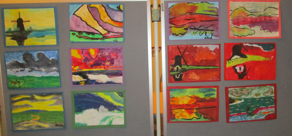 Musik und Kampfgeschrei strömt aus der Mediothek. Legohelden sterben auf der Leinwand. Y-Tong-Skulpturen sind auf den Tischen und der Wand nach ausgestellt. Einen Stock höher tummeln sich Schildkröten, diverse Fische und Oktopusse an der Wand. Die Linoldruckvorlagen für die Motive liegen auf der Bank davor. Beim Eingang warten Schalen mit Chips und Erdnüssen. Auf einem Tisch stehen die Getränke bereit. Schwalben sammeln sich und Delfine springen aus dem Wasser. Ein Fussballer macht einen Salto, Pferde springen über Hürden und Motocrosser rasen. Das sind die Ergebnisse vom Tief und Hochdruckkurs. Allmählich werden die letzten Namenstäfelchen an den Y-Tongskulpturn befestigt und die Bilder noch einmal zurecht gerückt. Die ersten Eltern treten ein, um in die Kreativwelt einzutauchen. Es wird rege erzählt und Erinnerungen ausgetauscht. Die ganze Kreativwoche scheint noch einmal aufzuleben. Mit der Zeit leeren sich nicht nur die Chipsschalen, auch im Schulhaus wird es ruhig. Was bleibt sind die Bilder, im Kopf oder auf Papier.