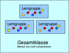 Da eine Lehrperson nicht überall zur gleichen Zeit sein kann, sind die Klassen in Lerngruppen organisiert. Die Lerngruppen geleitet von einer älteren Schülerin oder einem älteren Schüler planen und reflektieren ihr Lernen.