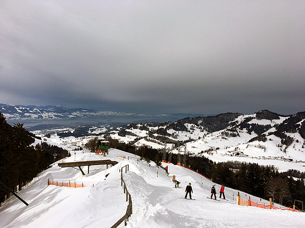 Unser Wintersportlager begann schneelos grün und endete nach Schneegestöber, Nebel und Sturm mit herrlichem Schneesportwetter.
