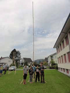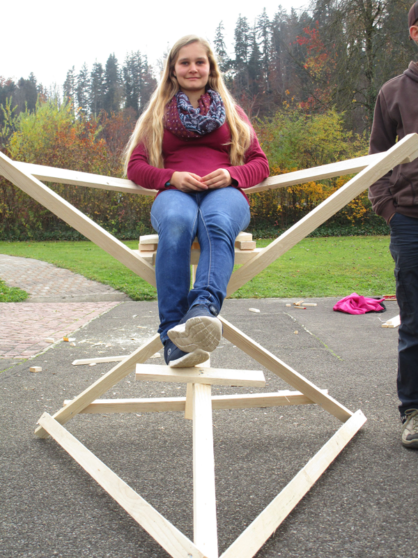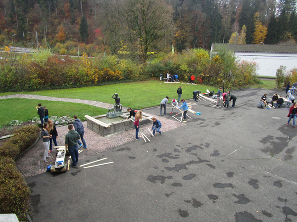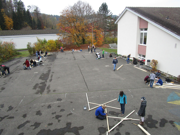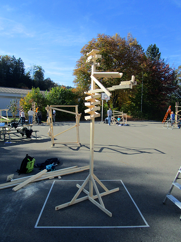 Am diesjährigen Denksportanlass wartete eine besondere Aufgabe auf die Lerngruppen: Jede Gruppe musste einen möglichst hohen Turm aus Dachlatten zusammenzimmern. Dabei galt es zuerst den Turm gemeinsam zu planen, ein Modell herzustellen und anschliessend den Plan in die Realität umzusetzen.
