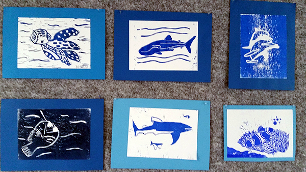 Im Kurs Linoldruck mussten wir zuerst einen Entwurf zum Thema Meeresbewohner und Unterwasserwelten zeichnen. Als wir den Entwurf fertig hatten, durften wir zum Thema passend ein Bild aussuchen, welches wir auf ein Kalkpapier abpausten. Wir nahmen eine Linolplatte, legten unter das Kalkpapier ein Kohlepapier und fuhren den Grundrissen nochmals nach. Die kniffligste Arbeit war mit dem Schnitzwerkzeug die